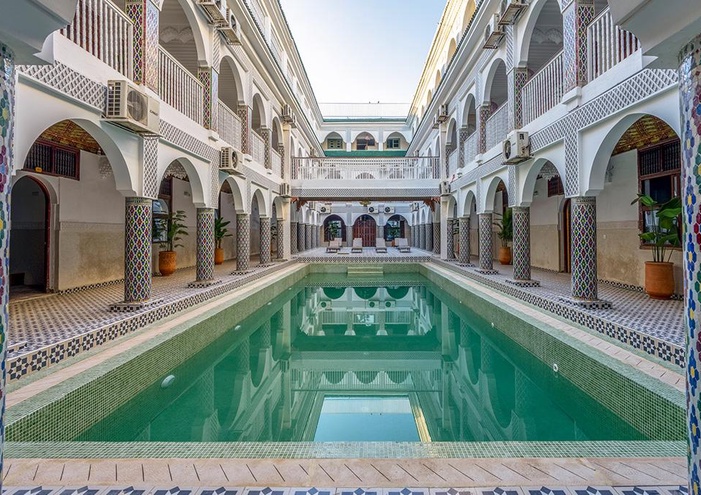 Bienvenue au Riad Palais Moulay Said 3* ! Au cœur palpitant de la médina de Marrakech, ce Riad vous invite à une parenthèse raffinée dans un cadre d’exception. Véritable joyau de l’architecture marocaine, ce palais historique marie avec élégance l’art traditionnel et le confort contemporain. Découvrez ses patios verdoyants, ses fontaines fraîches et ses salons aux tons chauds composant une atmosphère apaisante, typiquement orientale. Reposez-vous dans une chambre spacieuse et chaleureuse. Savourez une cuisine marocaine dans l’un des deux restaurants aux ambiances distinctes : l’un en formule buffet et l’autre mettant à l’honneur la cuisine marocaine réinventée du Beldi Fusion Kitchen. Un snack bar en bord de piscine vient compléter l’offre. Le petit déjeuner marocain vous sera servi sous forme de buffet généreux, idéal pour bien commencer la journée. Faites un tour à l’espace Spa et bien-être, proposant un hammam, un bain à remous balnéo traditionnel et plusieurs cabines de massage. Pour enrichir votre séjour, des cours de cuisine sont proposés. Vous pourrez également louer des vélos pour explorer la médina, notamment la célèbre place Jemaa el-Fna située à quelques pas. Ce riad est un lieu d’élégance, de sérénité et de découvertes, parfait pour s’imprégner de l’âme de Marrakech tout en savourant l’art de vivre marocain.