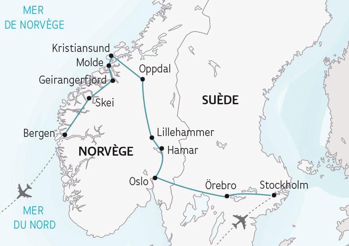 Votre voyage débutera par la découverte de Stockholm, la plus belle des capitales nordiques, ville au site et au patrimoine exceptionnel. Puis, vous rejoindrez la Norvège offrant quelques-uns des plus beaux paysages d'Europe. Les Fjords encaissés de l'Ouest, les routes panoramiques ou encore Bergen, ville hanséatique constituent la plus belle des destinations pour les amoureux de nature préservée. Un voyage riche en découvertes vous attend !