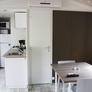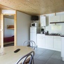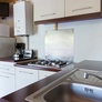 Cuisine équipée avec plaque de cuisson, réfrigérateur, micro-ondes, grille-pain, machine à café à capsules
