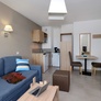 Kitchenette équipée (réfrigérateur, micro-ondes mixte, plaque vitrocéramique, cafetière à capsules, lave-vaisselle sauf dans appartement pour personne à mobilité réduite et certains logements selon la configuration de la cuisine)