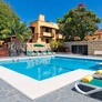 - Piscine extérieure chauffée aménagée de chaises longues et parasols.