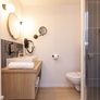Salle de bain avec douche, sèche-cheveux, sèche-serviettes