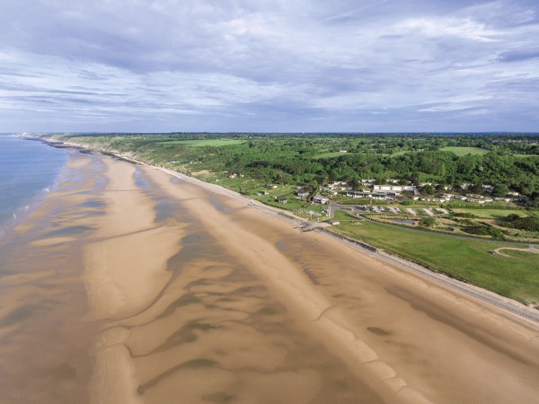 Niché entre mer et falaiss, les pieds dans l’eau au bord d’une plage de sable fin : la plage du débarquement "Omaha Beach"