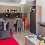 Coin cuisine avec grand frigo et grand lave-vaisselle, plaque vitrocéramique, table avec rabat pour 6 personnes micro-ondes, bouilloire, cafetière à filtre, cafetière à capsules, grille-pain)