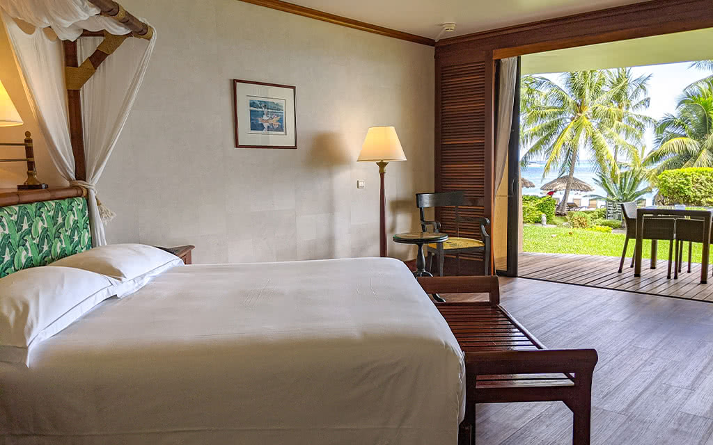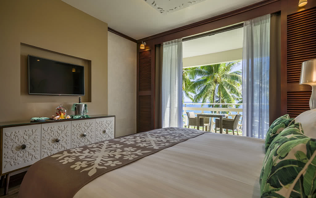 Ces chambres sont les plus spacieuses et disposent d'un balcon ou terrasse équipée d'une table avec deux chaises dont vous avez accès depuis les portes vitrées de la chambre, permettant à la lumière naturelle de rentrer facilement. Elles offrent une vue sur les eaux turquoises du lagon et sur l'océan.