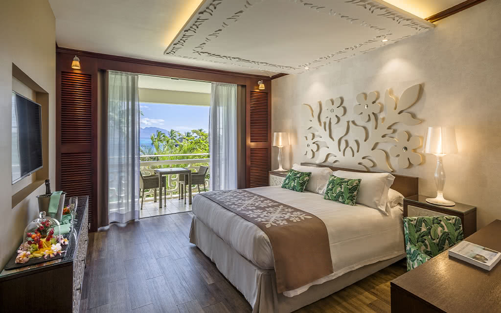 Ces chambres sont les plus spacieuses et disposent d'un balcon ou terrasse équipée d'une table avec deux chaises dont vous avez accès depuis les portes vitrées de la chambre, permettant à la lumière naturelle de rentrer facilement. Elles offrent une vue sur l'île de Moorea au loin ainsi que sur le lagon et l'océan.