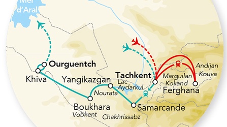 • la mer Aral, son cimetière à bateaux, ainsi que la vallée de Ferghana, les montagnes Nourata et le désert Kyzyl Kum